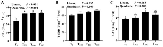 Effect of dietary curcumin on the antioxidation capacity of the duck breast muscle. (A) Effect of dietary curcumin on the GPx activity of the duck breast muscle. (B) Effect of dietary curcumin on the T-SOD activity of the duck breast muscle. (C) Effect of dietary curcumin on the CAT activity of the duck breast muscle. T0: ducks fed with the basal diet; T300, T400, and T500: ducks fed with 300, 400, and 500 mg of curcumin in kg−1 of basal diet. GPx, glutathione peroxidase; T-SOD, total superoxide dismutase; CAT, catalase. a, b Values with different letter above the column mean significant difference (p < 0.05).