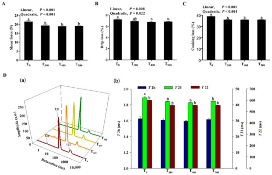 As shown in Figure 2A, curcumin supplementation significantly decreased shear force (p < 0.05). As shown in Figure 2B, C, drip loss (p = 0.049), and cooking losses (p = 0.006) significantly decreased with curcumin supplementation. As shown in Figure 2D, a decreasing T2b trend was observed in the samples with curcumin supplementation, but this was not a significant difference (p > 0.05). However, there were linear and quadratic decreases for T21 and T22 with curcumin supplementation (p < 0.01), and the T21 and T22 values were lowest in the T500 group.