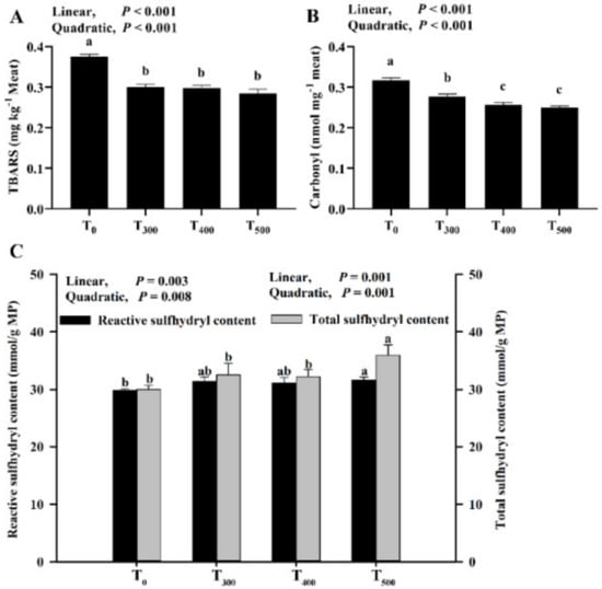 As showcased in Figure 3A, there were significantly decreased TBARS values with curcumin supplementation (p < 0.05) after 24 h at 4 °C, but no significant difference in the TBARS value was observed among the curcumin-supplemented groups (p > 0.05). As depicted in Figure 3B, the carbonyl content in the sample decreased with a linear (p < 0.001) and quadratic (p < 0.001) response with curcumin supplementation, and a significant decrease in carbonyl content among curcumin-supplemented groups was observed (p < 0.05). As demonstrated in Figure 3C, the reactive and total sulfhydryl contents in MP significantly increased with curcumin supplementation and were the highest in the T500 group.