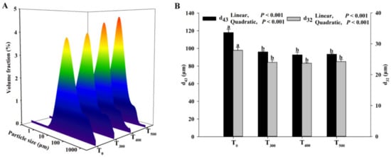 Effect of curcumin supplementation on the protein particle size of the duck breast muscle. (A) The average particle size (μm) was used to evaluate the size of protein. (B) d43 (volume-mean diameter), d32: volume-surface mean diameter. a, b Values with different letter above the column mean significant difference (p < 0.05).