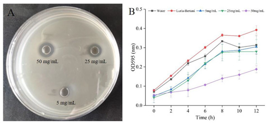 The antibacterial activity of the skin mucus extract against E. coli was assessed by the MIC and MBC values, and the determined values were 25 mg/mL and 50 mg/mL, respectively. As shown in Figure 1A, the antimicrobial activities of the skin mucus extract against S. aureus increased as the concentration of the skin mucus extract increased from 25 to 50 mg/mL. The absorptions at 595 nm of the sample treated with the skin mucus extract were significantly reduced at each growth stage, compared with those in the control (Figure 1B), indicating that the growth rate of S. aureus was significantly inhibited. The results revealed that S. aureus showed different growth rates in a dose-dependent manner under different concentrations of skin mucus extract. However, the rising trend in the late growth period may be due to the adaptability of the surviving cells to the changes in the environment and pressure. Similar research showed that the growth of human pathogenic bacteria would be suppressed in a dose-dependent manner after treatment with fish mucus extracts [20].