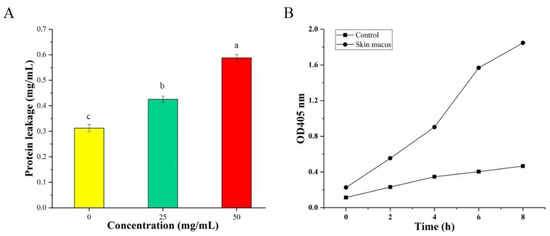 The protein leakage of intracellular compounds was measured to determine the antimicrobial mechanism of the skin mucus extract [16]. In brief, 1 × 106 CFU/mL bacterial solution was mixed with 25 and 50 mg/mL skin mucus extract and cultured at 37 °C for 4 h. Then, supernatants containing intracellular compounds were separated by centrifugation at 6000× g for 5 min and measured at OD570 by a microplate reader (Multiskan FC, Thermo, Waltham, MA, USA).