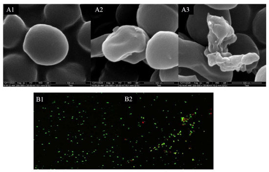 The test strain was cultured and collected as the way described in Section 2.6. The bacterial solution (10 μL) and stain (SYTO9:PI = 1:1, 5 μL) were mixed together and reacted for 10 min on a clean glass slide for 10 min before observing by CLSM [19]. The excitation wavelength and emission wavelength of SYTO9 were 480 nm and 500 nm, respectively. The excitation wavelength and emission wavelength of PI were set as 490 nm and 635 nm, respectively.