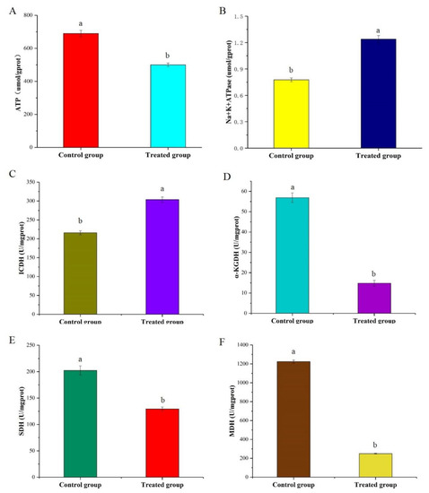 ATP is one of the few high-energy compounds that tissue cells can utilize directly, and it plays a central role in cellular energy metabolism. The results (Figure 4A) showed that the ATP content dramatically dropped from 690 to 500 μmol/gprot in the treatment group. Compared with the control group, ATP levels in the treated group were downregulated by 27.5%. Cinnamaldehyde could disrupt the metabolic pathway of citric acid and inhibit bacterial ATP synthesis [28]. Similarly, Turgis et al. [29] found that mustard essential oil reduced intracellular ATP levels. The decrease in ATP content may be caused by damage to energy metabolism or disruption of ATP synthase function in cells, which results in disordered ATP synthesis. Therefore, it can be inferred that the TCA cycle may be affected based on the ATP concentration results.