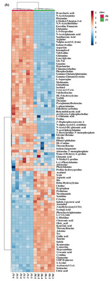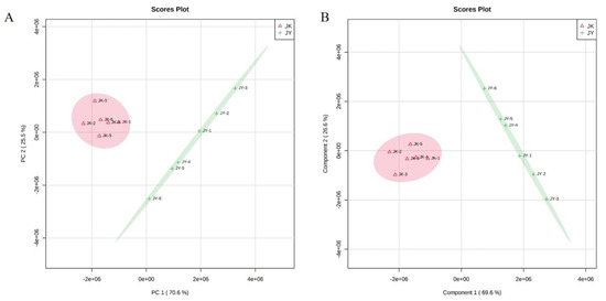 The original data obtained by LC–MS were converted to the ABF format by Analysis Base File Converter software and imported into MS-DIAL 4.10 for preprocessing, including the peak extraction, noise removal, deconvolution, peak alignment, and export of a three-dimensional data matrix in CSV format. Then, the extracted peak information was compared with databases including the three libraries MassBank, Respect, and GNPS for a full library search. The three-dimensional matrix information includes the following: the sample information, retention time, mass–nucleus ratio, and mass response intensity (peak area). The multivariate statistical analysis included principal component analysis (PCA), partial least squares discriminant analysis (PLS–DA), cluster analysis, and differential metabolite screening.
