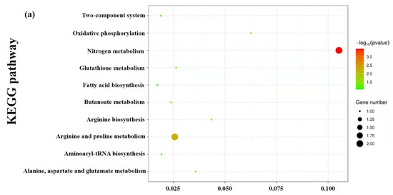 KEGG was used to investigate the biological categories of the identified metabolites. These metabolites were divided into different categories based on the type of compounds and their position in the metabolic pathway, such as nitrogen metabolism, arginine, and proline metabolism, alanine, aspartate and glutamate metabolism, oxidative phosphorylation, glutathione metabolism, arginine biosynthesis, fatty acid biosynthesis, butanoate metabolism, aminoacyl-tRNA biosynthesis and two-component system, which were significantly enriched for all of the identified differential metabolites (Figure 6a). Figure 6b is a constructed heat map visualizing the changes in metabolite profiles in response to the treatment of skin mucus extract, and it indicated that the skin mucus extract treatment interfered with the normal physiological metabolism of S. aureus. Moreover, the great mass of amino acids had elevated levels, and the contents of other metabolites in pathways were altered to varying extents in the treatment group.
