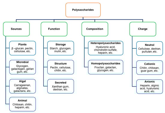 Plant polysaccharides offer diverse applications in the food and pharmaceutical sectors with distinct advantages over synthetic polymers, including availability (plants are abundant and sustainable), biocompatibility, biodegradability, low toxicity, swelling ability and water solubility [38,40,41]. The fundamental reason for the rapidly increasing interest in different plant polysaccharides is their convenience of cultivation and harvesting, which provides a continuous source of raw plant materials for polysaccharide extraction. These biopolymers are composed of multiple monosaccharide units with a high molecular weight and stable structures due to their strong intermolecular interactions [19,42]. Branching patterns, linkage, sequencing, and side-chain distributions of similar or different monosaccharide units are organized into exceedingly complex molecular structures. Furthermore, plant polysaccharides’ molecular structural properties contain numerous functional groups that may be changed or modified to generate high-quality polysaccharides [43].
