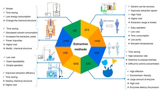 Each approach has distinct benefits and limitations regarding economic cost, material complexity, time consumption, environmental effects, energy, and extraction efficiency [50,53,54] (Figure 2). MAE is time-saving and environmentally friendly since it uses fewer solvents and energy and uses microwave radiation to increase the mass transfer of the target chemicals. However, it alters the structure of polysaccharides and is expensive [50]. The UHPE method boosts the solubility of object compounds, enabling them to permeate better into the sample matrix with reduced solvent consumption. However, this process may affect the chemical structure of polysaccharides [38]. The UAE is a fast, energy-efficient process with the least solvents and can produce high extraction rates [47]. SFE is an excellent method to extract plant polysaccharides since it is non-polluting, non-toxic and maintains polysaccharide activity. However, due to the high cost and extended extraction time, it is mostly used to extract and prepare important plant-based active components [55]. The most common method of polysaccharide extraction is a combination of hot HWE and enzymatic methods, which was shown to generate higher polysaccharide yields and purity than mono-extraction methods [56]. In addition, enzymes (cellulase, protease, pectinase, etc.) are used to hydrolyze and break down plant tissues in relatively moderate conditions (mild reaction conditions, short time, reduced chemical reagents) to accelerate polysaccharide release, even though the cost of the enzymes is relatively high [57].