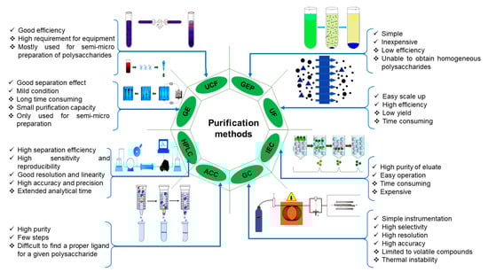 Separation and purification of polysaccharides from the root of Pueraria lobata were accomplished using a Sephacryl S-100 gel filtration column and a DEAE-Cellulose 52 anion exchange column. Polysaccharide production was 0.04%, and experimental results revealed that polysaccharide had a molecular weight of 2584 Da and was a type of glucan [73]. Likewise, the black currant fruit was used to extract a new polysaccharide fraction and purified using anion-exchange Q-Sepharose FF, chromatography on macroporous resin D4006, and Sephadex G-100 columns [74]. Furthermore, owing to the difficulty of obtaining pure polysaccharides using a single technique, a mix of methods is required to accomplish effective polysaccharide purification. To this end, this procedure should also consider the sequence and scope of application of each technique. However, potential research remains challenging and essential to prepare high-purity polysaccharides on a large scale while preserving their structural similarities and bioactivity. Thus, comprehensive research of novel techniques and materials is necessary to identify the polysaccharide structural properties and assist innovative polysaccharide purification.