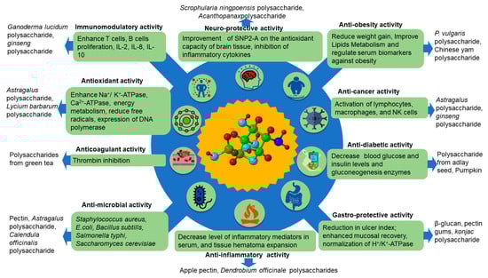 Polysaccharides were proven in recent research to offer a variety of biological benefits, such as anticoagulant (polysaccharide from green tea), antioxidant (Astragalus polysaccharide, Lycium barbarum polysaccharide), antibiotic (pectin, Calendula Officinalis polysaccharide), immunomodulatory (Ganoderma licidium polysaccharide, Ginseng polysaccharide), antidiabetic (polysaccharides from adlay and pumpkin), and anti-inflammatory (apple pectin, Dendrobium officinale polysaccharide) activities [93,94]. These bioactive polysaccharides derived from edible resources are safer, more effective and have fewer side effects than other sources. They are also more easily accessible and inexpensive. Thus, most bioactive polysaccharides from different plant sources constitute a significant material source for food and therapeutic applications [95]. For instance, polysaccharides isolated from psyllium seeds and husk, for example, had the greatest antioxidant and scavenging activity, with significant concentrations of 347.40 ± 1.79 μg and 362.72 ± 2.75 μg, respectively [96]. Astragalus polysaccharide was shown to enhance the glucose and lipid metabolism of type 2 diabetes mellitus (T2DM) rats by boosting insulin production through a protective impact on pancreatic islet beta cells [97]. Furthermore, when two polysaccharides from Codonopsis pilosula (named CPP1a and CPP1c) were incubated for 48 h at concentrations of 50, 200, and 400 g/mL, they significantly inhibited cell migration in human hepatocellular carcinoma (HepG2) cells, demonstrating considerable cytotoxicity. Thus, at the molecular level, altering the cell structure, initiating cell death, and arresting the cell cycle in the G2/M phase (second growth phase/mitosis phase), along with increasing the Bax/Bcl-2 (apoptosis regulator) protein expression ratio and triggering caspase-3 [98]. Figure 4 below presents further information regarding the polysaccharides’ bioactivity and biological behavior, along with typical polysaccharide examples.