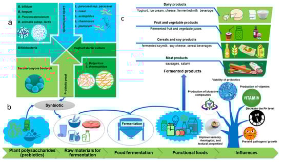Schematic demonstration of the potential influence of plant polysaccharides in food fermentation. (a) probiotic bacteria most used in synbiotic fermentation, (b) fermentation process, (c) synbiotic fermented products with increased health benefits.