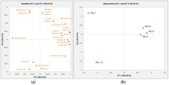 Principal component (PC) loadings and scores of the attributes (a) and five soymilk samples (b).