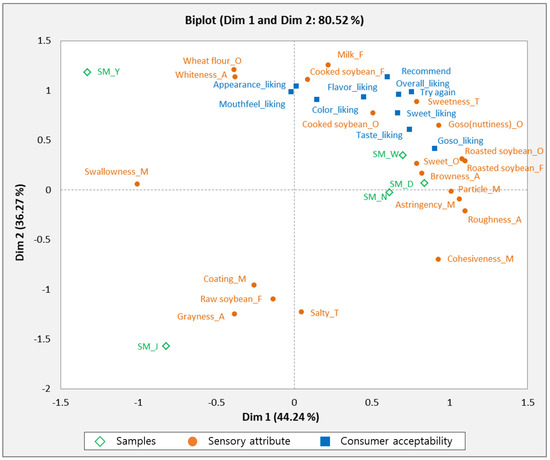 PCA was used to identify the relationship between the descriptive attributes and the samples in Figure 2. The PCA biplot represented 80.52% of the total variation with 44.24% (PC 1) and 36.27% (PC 2). The right side of PC 1 was associated with cooked soybean, sweet, roasted soybean, goso flavor (nuttiness), particle, astringent, and browny sensory attributes, and the SM_W, SM_N, and SM_D soymilk samples were closely related to those attributes. SM_W and SM_N showed similar sensory attributes because they were synthesized in the laboratory using the same ingredients. The negative side showed that raw soybean, coating, grayness, and salty attributes were related to the SM_J sample. Wheat flour and whiteness were located on the positive side of PC 2 and were closely associated with the SM_Y sample.
