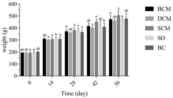 Effects of dietary fat cooked using different methods on the body weights of rats. Different letters at the same time point indicate significant differences (p < 0.05). BCM, braised cooking method; SCM, stewed cooking method; DCM, deep frying cooking method; SO, soybean oil; BC, blank controls.