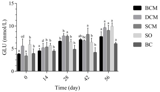Glycolipid metabolism is essential to life. As shown in Figure 2, as the experimental feeding time progressed, the level of GLU metabolism of rats in the BCM, SCM and DCM groups showed slowly increasing trends that differed significantly from the trend in the BC group. From the graph, the GLU level of rats in the BCM group showed no difference after 28 days of feeding. A significant difference occurred at 42 days of feeding. The DCM group showed an upward trend from 0 to 28 days and showed a decrease after feeding at 42 days. At 56 days, this group showed an upward trend again. There was no significant difference in GLU of rats in the SCM and SO groups during the feeding process.