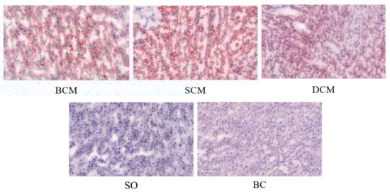 Figure 3 shows the liver fat deposition in rats that consumed pork fat cooked using the three different methods. Microscopical analysis of frozen liver tissue sections stained with oil red O revealed that the samples from the BCM and SCM groups had obvious red-stained areas. Abundant diffuse fat droplets of varying sizes were observed in the liver tissue of the BCM and SCM groups, with many large vesicle-like fat droplets. A few small, red-stained fat droplets were observed in the liver tissues of rats in the DCM group. Liver tissues from rats in the SO and BC groups contained the fewest fat droplets, and they were not easy to distinguish without a machine. Compared with the SO and BC groups, the BCM, SCM and DCM groups all showed different degrees of increase, with a darker color, a gradually expanded area of fat droplets, and the fat droplets distributed in different patterns. A higher amount of fat deposition was observed in the liver tissues of rats in the SCM group than in the BCM and DCM groups, and the difference was significant (p < 0.05).