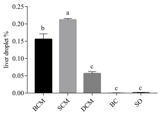Effects of pork fat cooked using different methods on the liver droplet contents in rat liver tissues. Note: Different letters (a, b and c) indicate significant differences (p < 0.05). BCM, braised cooking method; SCM, stewed cooking method; DCM, deep frying cooking method; SO, soybean oil; BC, blank controls.