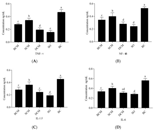 Effects of pork fat cooked using different methods on the concentrations of TNF-α (A), NF-κB (B), IL-β (C), and IL-6 (D) in rat liver tissues. Note: Different letters (a, b and c) indicate significant differences (p < 0.05). BCM, braised cooking method; SCM, stewed cooking method; DCM, deep frying cooking method; SO, soybean oil; BC, blank controls.