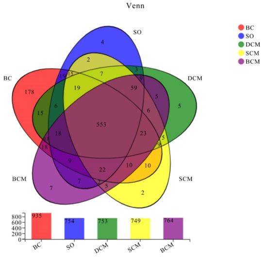 The gut microbiota of rats in all five groups was analyzed. The operational taxonomic unit (OTU) distribution diagrams are shown in Figure 6. Overall, 553 OTUs were shared by all experimental groups, while 7, 2, 5, 4 and 178 OTUs were unique to the BCM, SCM, DCM, SO and BC groups, respectively. Significant differences in the numbers of OTUs between the different groups of rats fed with pork fat cooked using different methods reflect the differences in the composition of the intestinal microbial flora between the different experimental groups due to differences in the cooking methods.