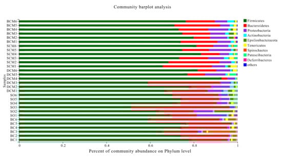 As shown in Figure 7, at the phylum level, the distribution patterns differed between the experimental groups. Firmicutes, Proteobacteria and Bacteroidetes were the dominant bacterial phyla in the intestines of rats in all groups, except for Proteobacteria in the BC group. The abundances of all three phyla changed in the three cooking method groups relative to the SO or BC group (p < 0.05). Furthermore, a comparison with the SO group revealed a significant increase in the abundance of Firmicutes and a significant decrease in the abundance of Bacteroidetes in the BCM, SCM and DCM groups (Table 4). Compared with the BC group, the BCM, SCM, DCM and SO groups had a significantly increased abundance of Proteobacteria (p < 0.05). However, there were no significant differences between the BCM, SCM and DCM groups in terms of abundance at the phylum level.