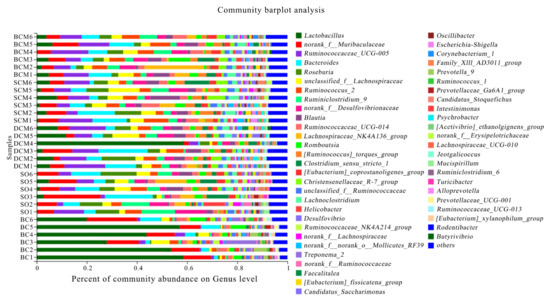 The genus Ruminococcaceae accounted for the largest proportion of the gut microbiota, with values of 9.31 ± 1.26% in the BCM group, 7.67 ± 1.07% in the SCM group, 10.74 ± 1.57% in the DCM group, 6.52 ± 2.02% in the SO group and 2.24 ± 0.75% in the BC group. The differences between the BC group and the other groups were significant.