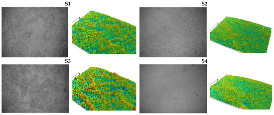 The microstructure of the foils can be observed in Figure 1. According to SEM images and microtopographies, the homogeneity is greatly influenced by the films’ composition. Thus, the decrease of the plasticizer content had an effect in obtaining films with a less smooth microstructure—S11–S15, and with higher fragility and brittleness. The results obtained are not surprising, given that they were also found in other research studies that have focused on the importance of plasticizers and, implicitly, glycerol, on the development of biopolymer films. Thus, when added to the film-forming composition, the plasticizer improved the physical and mechanical properties [40,41,42], but increased the solubility of the films obtained [43,44]. According to the results, the increase in glycerol concentration from 10 to 50% was directly proportional to the increase in water solubility (from 23.21% to 33.37%). In our study, the higher amount of glycerol used was 1.00 g and 22.22%, respectively. The amount was sufficient for the development of a film with superior physical and mechanical characteristics (S4).