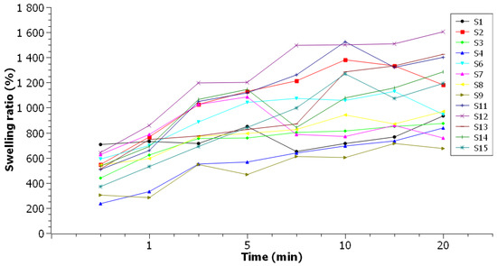 The swelling ratio (Figure 2—representation of the average results of the testing) couldn’t be applied to the films S5 and S10 due to their very high solubility, as they did not retain their integrity even after 30 s of immersion. Films with high agar content in the composition presented low values of swelling ratio—S3, S7, S9, S11 and S12 films, with higher sodium alginate content in the composition showing high hydration capacity. However, the S13 and S14 samples deviate from the obtained results, which, although they have a high sodium alginate content in the composition, had high values of swelling ratio—1423.75% and 1286.89%, respectively.