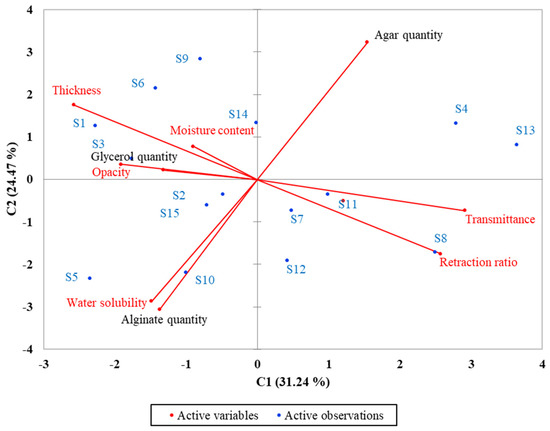 Principal component analysis (PCA) was performed for all 15 samples (S1–S15) to highlight the correlation between quantities of some products (agar, alginate and glycerol) and the characteristics of the obtained films (thickness, moisture content, transmittance, retraction ratio, water solubility and opacity), and the results are presented in the biplot from Figure 3.