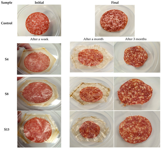 As can be seen form Figure 4, the appearance of the slice of salami packed in S13 foil looks like the one packed in the classic, multilayer package, obtained from successive layers of polyethylene, ethylene, metal foil and glue. The slices of salami packaged in foils S4 and S8, although they had a lower mass (the packaging allowed the transfer of moisture content and, implicitly, the elimination of water from the product), still look very good. These confirm other results obtained by us when, by using agar, alginate, glycerol, and stevia, we developed a film with applications for the cheese and meat products industry. Thus, the prosciutto packaged in these biopolymeric materials and maintained for five months, kept its physical and microbiological characteristics better than the classic packaging [37].