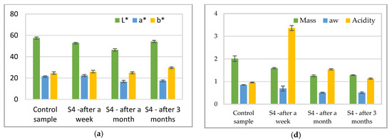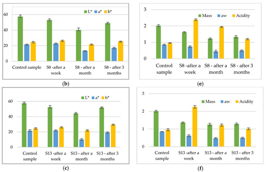 Physical-chemical parameters of sliced salami: Color parameters results for (a) salami slices kept in S4 packaging material (b) salami slices kept in S8 packaging material, (c) salami slices kept in S13 packaging material; mass, aw and acidity: (d) salami slices kept in S4 packaging material (e) salami slices kept in S8 packaging material, (f) salami slices kept in S13 packaging material.