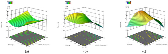 3 D Surface optimization of the films regarding acidity—mass of biopolymers/plasticizer (a) after a week, (b) after a month, (c) after 3 months.