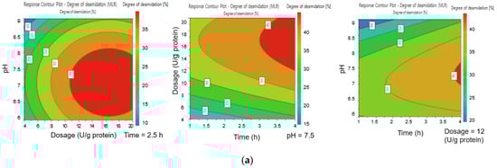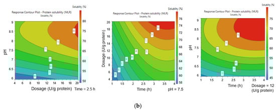 (a) Contour plots for deamidation degree (DD): on the left side is the pH as a function of dosage (U/g protein) with incubation time as a constant (2.5 h), in the middle is the dosage (U/g protein) as a function of time with pH as a constant (pH 7.5), and on the right side is the pH as a function of time (h), with dosage being constant (12 U/g protein). (b) Contour plots for protein solubility (PS): on the left side is the pH as a function of dosage (U/g protein) with incubation time as a constant (2.5 h), in the middle is the dosage (U/g protein) as a function of time, with pH as a constant (pH 7.5), and on the right side is the pH as a function of time (h), with dosage being constant (12 U/g protein).