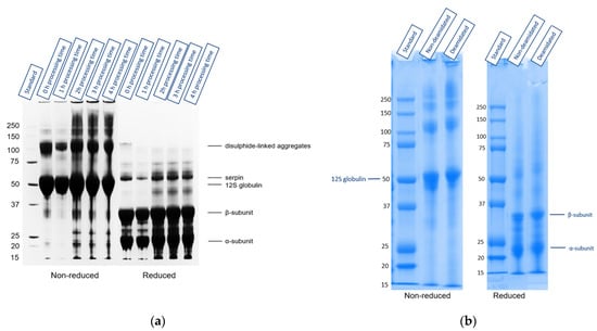 SDS-PAGE was undertaken to determine whether the structure of oat proteins was changed during the extraction process (Figure 3a). Furthermore, SDS-PAGE was performed from the DE-UF-OPC and UF-OPC, to determine if there were any noticeable differences between the oat protein concentrates (Figure 3b). There was a slight, but noticeable, shift in the DE-UF-OPC protein bands compared to the UF-OPC, which was most probably due to the deamidation of oat proteins. The main oat protein band was approximately 50 kDa in the non-reduced SDS-PAGE, in both DE-UF-OPC and UF-OPC (Figure 3b). Under reducing conditions, the 30 kDa and 20 kDa bands were the most dominant in both SDS-PAGEs. Walburg and Larkins [] reported the 50 kDa band as a native oat globulin protein that breaks into 30 kDa and 20 kDa subunits in reducing conditions. These results were in agreement with Immonen et al. [], who used SDS-PAGE to characterize the structure of destarched oat protein concentrate.