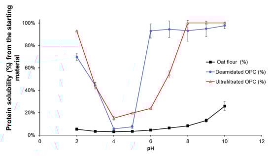 Protein solubility of oat flour (starting material), deamidated and ultrafiltrated oat protein concentrate (DE-UF-OPC), and ultrafiltrated oat protein concentrate (UF-OPC) as a function of pH (2.0–10.0).