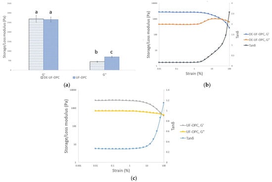 (a) Storage modulus (G′) and loss modulus (G″) of deamidated and ultrafiltrated oat protein concentrate (DE-UF-OPC) and ultrafiltrated oat protein concentrate (UF-OPC) at 0.1% strain. Different letters (a, b, c) indicate significant differences (p < 0.05) between the storage and loss modulus. (b) Storage modulus (G′) and loss modulus (G″) of deamidated and ultrafiltrated oat protein concentrate (DE-UF-OPC) as a function of strain (%) and right-side y-axis tanδ as a function of strain (%). (c) Storage modulus (G′) and loss modulus (G″) of ultrafiltrated oat protein concentrate (UF-OPC) as a function of strain (%) and right-side y-axis tanδ as a function of strain (%).