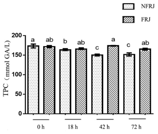The TPC of FRJ and NFRJ are displayed in Figure 2. With increasing fermentation time, the TPC of NFRJ decreased while no significant difference in the FRJ TPC was observed. The TPC of FRJ was significantly higher than the TPC of NFRJ at 42 h (173.67 ± 2.16 versus (vs) 150.19 ± 6.04 mmol gallic acid/L) and 72 h (165.00 ± 6.35 vs. 151.64 ± 10.29 mmol gallic acid/L).