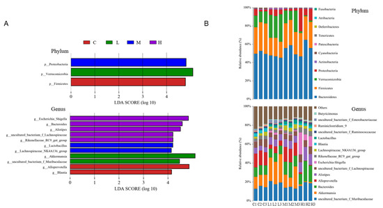 The dominant composition of gut microbiota after FRJ treatments. (A) Linear discriminant analysis (LDA) effect size (LEfSe) analyses at phylum and genus level (LDA score > 4.0). (B) Relative abundance of microbiota at phylum and genus level. C: mice fed with standard diet; L: mice fed with 3% (wt:wt) FRJ supplementation; M: mice fed with 6% (wt:wt) FRJ supplementation; H: mice fed with 9% (wt:wt) FRJ supplementation. Each number of the samples represents one replicate.