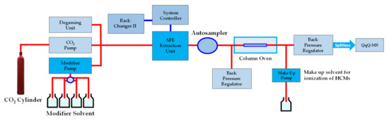 Schematic representation of the online supercritical fluid extraction–supercritical fluid chromatography–mass spectrometry (SFE-SFC-TQ-MS/MS).