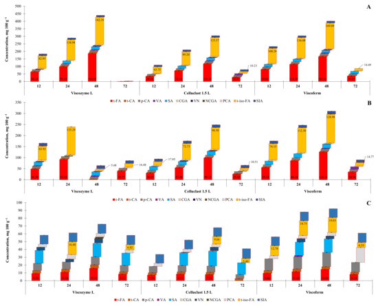 In general, considering Viscozyme L and Viscoferm have higher declared xylanolytic than cellulolytic activity, which was also confirmed by Wikiera et al. [61], it can be assumed that the degradation of cellulose-composed cell wall membranes using cellulolytic enzymes is more important for the efficient release of FTA than using xylanolytic enzymes.