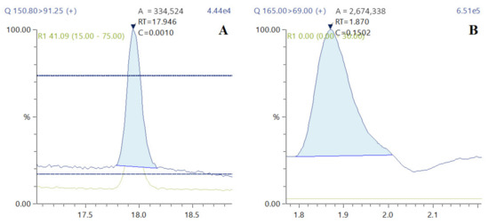 The analyses were carried out using a Shimadzu series Nexera UC SFC-SFE-LC system (Tokyo, Japan) coupled to TQ-MS-8050 (Tokyo, Japan) with an electrospray ionization interface (ESI). A sample of 1 μL was injected onto a reversed-phase Shim-pack UC-RP column (5.0 μm, 250 × 4.6 mm; Tokyo, Japan) operating at 45 °C and a flow rate of 1.0 mL min−1. The mobile phases used were acidified DDW (0.002% formic acid, v/v) supplemented with 5 mM ammonium formate (A) and acidified MeOH with 5 mM ammonium formate (0.002% formic acid, v/v) (B). Separation of compounds was done using the following gradient conditions: elution started with 5% B to obtain 10% B at 5 min, 60% B at 12–15 min, and 10% B at 18 min. Furthermore, MeOH injections were included every three samples as a blank run to avoid the carry-over effect. Data acquisition, analysis, and processing were performed similarly as for the online SFE-SFC-TQ-MS/MS analytical conditions for hydroxycinnamates (Section 2.10).