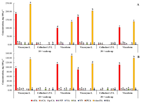 A 10- and 30-fold scale-up was carried out using a bioreactor and parameters developed for small-scale FA release. The release of FA and other HCMs was analyzed after 48 h of EH, since reduction in the content of both FA isomers was observed for wheat bran, while no significant changes in the release of HCMs took place for rye bran during further 24 h of a small-scale EH process (Figure 4). Besides, additional energy input would make this process not economically feasible, resulting in a higher price of the final product.