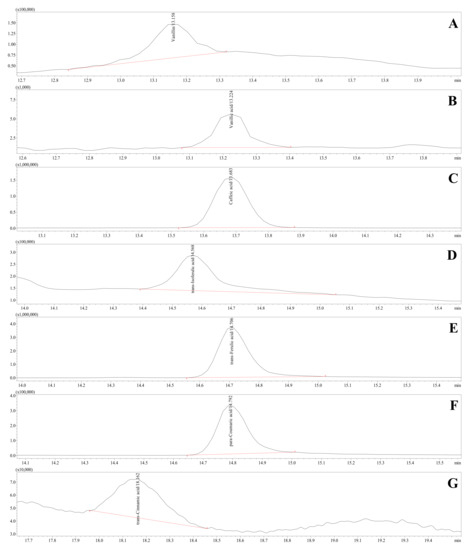 Representative profile of HCMs detected in rye bran hydrolysates, VN (A), VA (B), CA (C), t-iso-FA (D), t-FA (E), p-CA (F), and t-CA (G), using HPLC-ESI-TQ-MS/MS operating in the multiple reaction monitoring mode.
