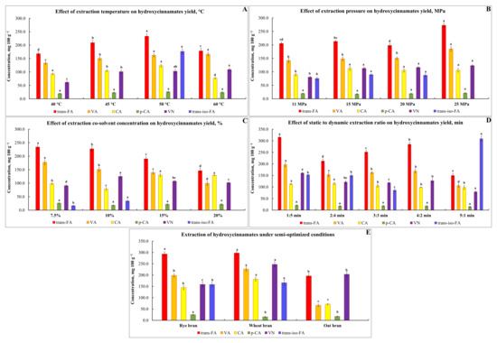 It is worth noting that the presence of t-iso-FA was found only when rye bran samples were subjected to extraction at 50 °C. Therefore, an extraction temperature of 50 °C was used for subsequent extractions. The third prevalent compound extracted from rye bran samples by means of SFE-CO2 was VA. The yield of this HCM fluctuated in the range of 133.2–166.4 mg 100 g−1. It should be admitted that the value of VA was found to be significantly higher than that yielded during EH, indicating a possible decarboxylation process of free VA caused by elevated temperature during hydrolysate autoclaving. The presence of 4-VG as the primary degradation product of VA was also confirmed by [45].