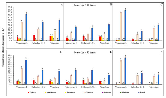 The release of mono- and disaccharides after enzymatic hydrolysis of rye (A,D), wheat (B,E), and oat (C,F) bran samples for 48 h with three multi-enzyme complexes, i.e., Viscozyme L, Celluclast 1.5 L, and Viscoferm (g 1000 mL−1 of hydrolysate). Note: The process was performed under 10- and 30-fold scale-up process conditions. Values are means ± SD of triplicates (n = 3). Means within the same sugar with different superscript letters (a,b,c,d,e,f) are significantly different at p < 0.05.