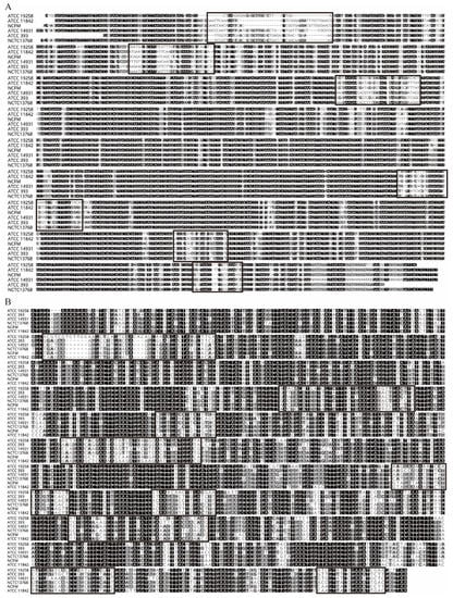 Multiple alignments of 16S rRNA and tuf genes of six lactic acid bacteria (LAB) model strains. (A): Multiplexed 16S rRNA gene comparison of six model strains of LAB; (B): multiple comparison of tuf gene of six model strains of LAB.