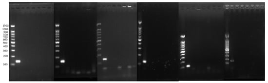 The primer design software Primer Premier 6 was used to design specific primers for 6 strains of LAB, and the length of the amplified fragments of the primers was about 150 bp. The specificity of the primers was evaluated by using the Basic Local Alignment Search Tool (BLAST) database on the NCBI website []. The software CE Design was used to develop cloning primers with homology arms. Afterward, the designed primers were synthesized by Shenggong Biological Engineering Co., Ltd. (Shanghai, China), Then, the LAB DNA of known species isolated were used to experimentally verify the specificity of the designed primers, as follows: Lactobacillus delbrueckii subsp. bulgaricus CICC 6045 (LB), Streptococcus thermophilus CGMCC1.1864 (ST), Lactobacillus acidophilus CICC6074 (LA), Limosilactobacillus fermentum CGMCC1.7434 (LF), Levilactobacillus brevis CGMCC1.5954 (LB), Lacticaseibacillus casei CGMCC1.5956 (LC). In the 6 reaction system groups, 7 tubes were set in parallel. In reaction systems 1–6, the primers were LA, LB, LC, LD, LF, and ST. The templates in each reaction system were the extracted DNA of 6 strains, and 1 tube of negative control. PCR reaction conditions and procedures are shown in Table 1 and Table 2. The PCR reaction product was checked by 1% (w/v) agarose gel electrophoresis, the electrophoresis condition was 130 V constant pressure for 30 min, and the test result was analyzed by the gel imaging system.
