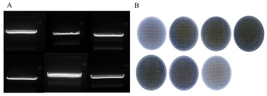The aim of this part of the experiment was to modify the pUC19 plasmid by inserting the tuf gene of LAB. As shown in Figure 3A, pUC19 was extracted from E. coli, which was digested with enzymes, and the bands were sufficiently separated. The recovered bacteria were evenly spread on the agar medium with ampicillin (Amp) resistance. The pUC19 plasmid carried the Amp resistance gene, which, when introduced into E. coli, enabled E. coli to acquire Amp resistance and grow normally on a plate containing Amp. In Figure 3B, the E. coli that was not transformed with pUC19 did not grow on the plate containing ampicillin, and it was transformed with pUC19 (carrying the DNA fragment of the target strain) E. coli was grown normally, and the target genes of the six strains were successfully transformed. Positive transformants grown on the plates were expanded, plasmids were extracted and verified by PCR, which confirmed the successful transformation.