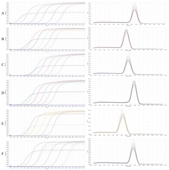 As can be seen from the left side of Figure 4, the amplification curve was based on the copy number concentration of the plasmid for gradient amplification. In Figure 4, the melting curves of the six strains were single, with only one peak, indicating the lack of interference from primer dimers and showing a great amplification effect. After the qPCR reaction was completed, the standard curve was plotted using the number of threshold cycles (Cq, the number of cycles taken for the fluorescence signal to reach the set threshold in each reaction tube) as the vertical coordinate and the logarithm of the concentration of the control (pUC19 plasmid) as the horizontal coordinate. The standard curve of six strains was obtained, LA: Y = −3.203X + 34.08 (R2 = 0.9977); LB: Y = −3.1011X + 32.72 (R2 = 0.9981); LC: Y = −3.2385X + 38.66 (R2 = 0.9993); LD: Y = −3.171X + 34.18 (R2 = 1.0000); LF: Y = −3.4382X + 35.85 (R2 = 0.9972); and ST: Y = −3.1994X + 33.85 (R2 = 0.9969). The template showed an excellent linear relationship within the dilution range, and the detection line was 1 × 103–1 × 108 copies/µL.