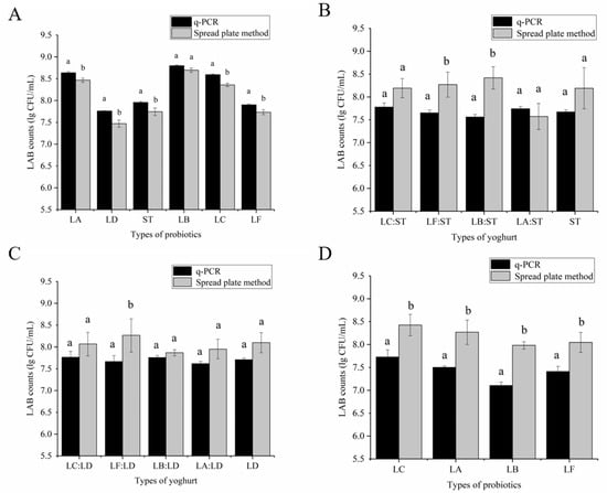 Comparison of spread plate method and qPCR. (A): Comparison in the enumeration of six species of LAB monobacterial fermentation. (B): LC:ST, LF:ST, LB:ST, LA:ST, and ST; counting ST was represented in yogurt fermented by different combinations of LC + LD + ST, LF + LD + ST, LB + LD + ST, LA + LD + ST, and LD + ST, respectively. (C): the LDs in yogurt fermented with different strain combinations were counted. (D): indicated that LC, LA, LB, and LF were counted separately in yogurt fermented by different combinations of strains. If p < 0.05 indicated a significant difference, p ≥ 0.05 indicated that the difference was not significant, the letter “a, b” were used for significance marking.