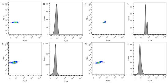 Determination of LAB in Yogurt by Flow Cytometry. (A,E) were the FCM distribution of SYTO9 and PI single-stained negative control, respectively. (B,F) were the distribution of SYTO9 and PI single-stained negative control cells and fluorescence intensity, respectively. (C,G) are the distribution of SYTO9 and PI single-stained positive control flow cells, respectively. (D,H) are the distribution of SYTO9 and PI single-stained positive control cells and fluorescence intensity, respectively.